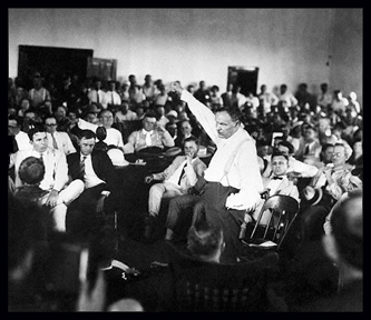 On the seventh day of trial, Raulston asks the defense if it had any more evidence. What follows is probably the most amazing court scene on Anglo-Saxon history. Williams Jennings Bryan is called to the stand as an expert on the Bible. Bryan assents, stipulating only that he should have a chance to interrogate the defense lawyers. He takes a seat on the witness stand, and begins fanning himself. Darrow begins his interrogation of Bryan with a quiet question: "You have given considerable study to the Bible, haven't you, Mr. Bryan?" Bryan replies, "Yes, I have. I have studied the Bible for about fifty years." Thus begins a series of questions designed to undermine a literalist interpretation of the Bible. Bryan is asked about a whale swallowing Jonah, Joshua making the sun stand still, Noah and the great flood, the temptation of Adam in the garden of Eden, and the creation according to Genesis. After initially contending that "everything in the Bible should be accepted as it is given there," Bryan finally concedes that the words of the Bible should not always be taken literally. In response to Darrow's relentless questions as to whether the six days of creation, as described in Genesis, were twenty-four hour days, Bryan says "My impression is that they were periods." Bryan, who began his testimony calmly, stumbles badly under Darrow's persistent prodding. At one point the exasperated Bryan says, "I do not think about things I don't think about." Darrow asks, "Do you think about the things you do think about?" Bryan responds, to the derisive laughter of spectators, "Well, sometimes." Both old warriors grow testy as the examination continues. Bryan accuses Darrow of attempting to "slur at the Bible." He says that he will continue to answer Darrow's impertinent questions because "I want the world to know that this man, who does not believe in God, is trying to use a court in Tennessee--." Darrow interrupts, "I object to your statement" and to "your fool ideas that no intelligent Christian on earth believes." Raulston orders the court adjourned and the next day strikes Bryan's testimony from evidence. The confrontation between Bryan and Darrow is reported by the press as a defeat for Bryan. His performance is described as that of "a pitiable, punch drunk warrior." The trial is nearly over. Darrow asks the jury to return a verdict of guilty in order that the case might be appealed to the Tennessee Supreme Court. The jury complies with Darrow's request, and Judge Raulston fines him $100. Six days after the trial, William Jennings Bryan is still in Dayton. After eating an enormous dinner, he dies in his sleep. Clarence Darrow is hiking in the Smoky Mountains when word of Bryan's death reached him. When reporters suggested to him that Bryan died of a broken heart, Darrow says, "Broken heart nothing; he died of a busted belly."